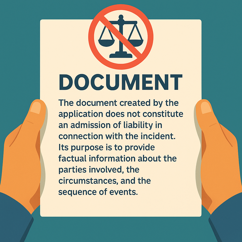 The document created by Mobile-TAG does not represent an admission of fault or liability. Its purpose is to summarize factual information as entered by the user about the incident.