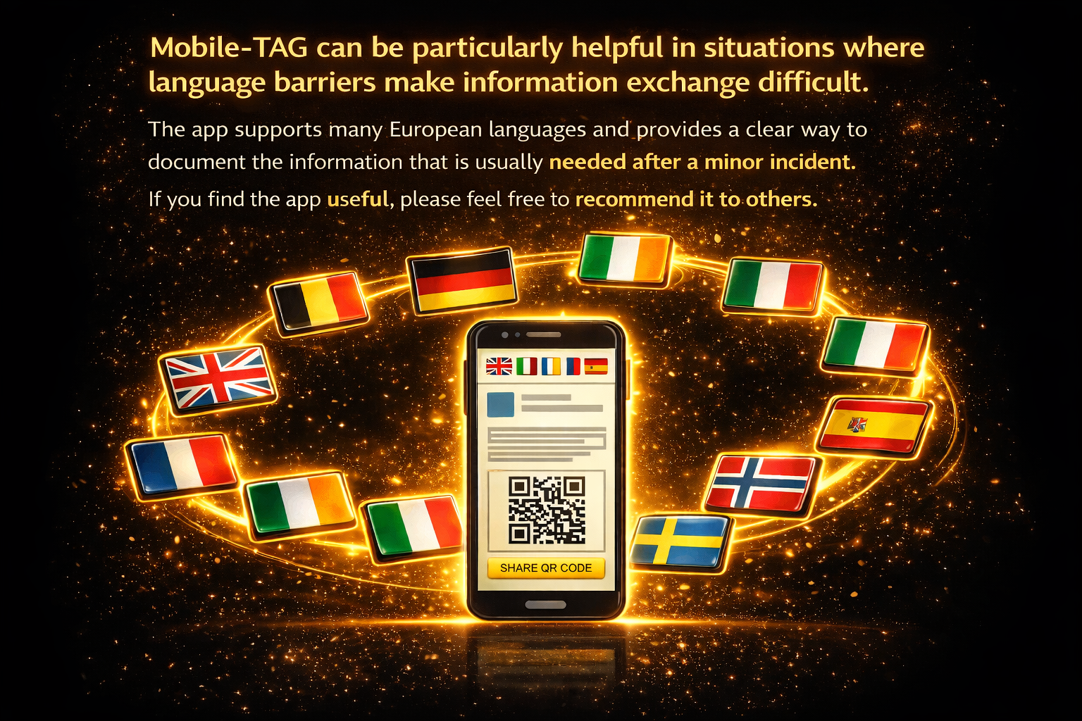 Mobile-TAG is a tool designed to help drivers exchange and organize information after a traffic-related incident. It does not replace official reports or any procedures required by authorities or insurance companies.
